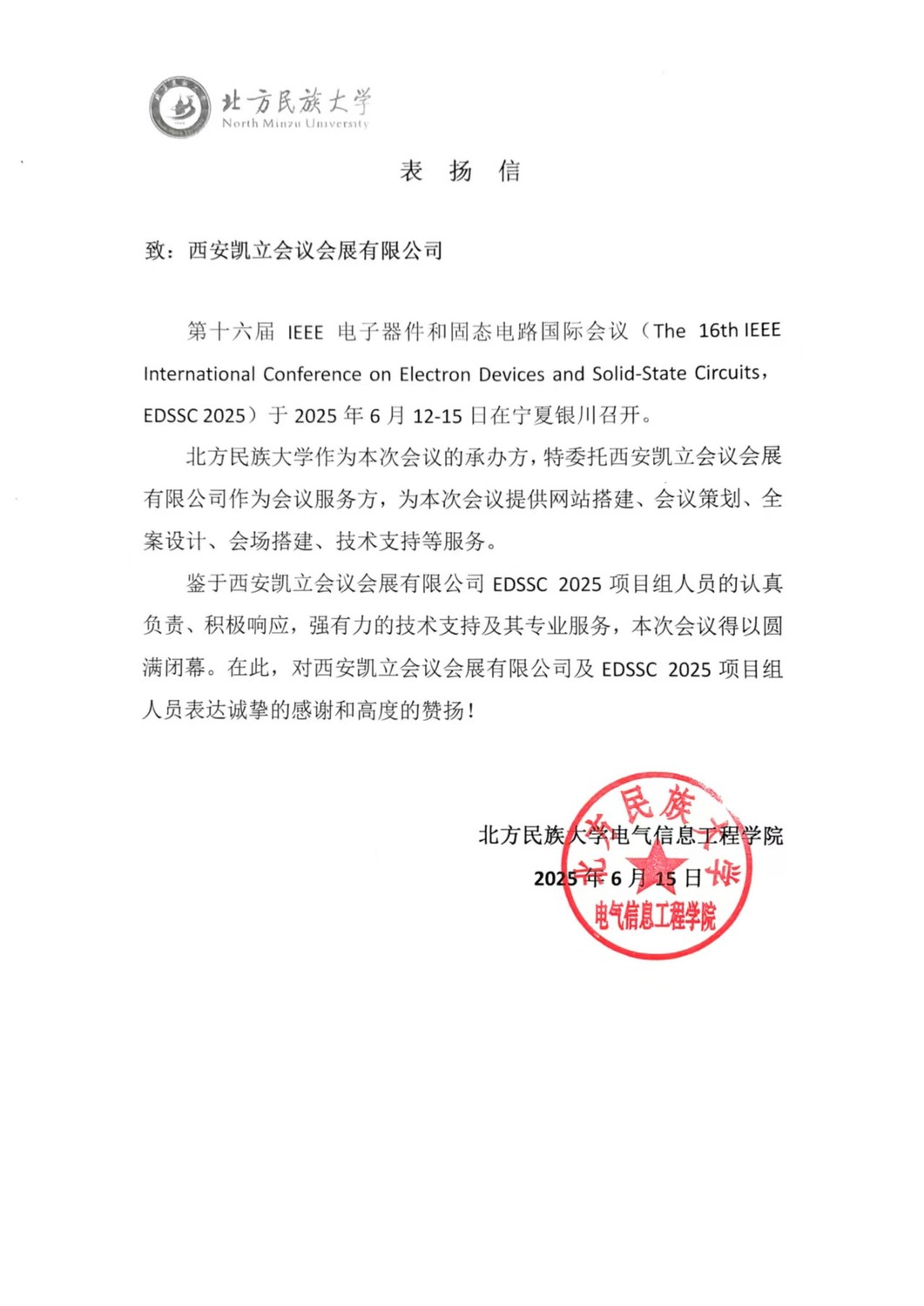 来自北方民族大学的感谢信: